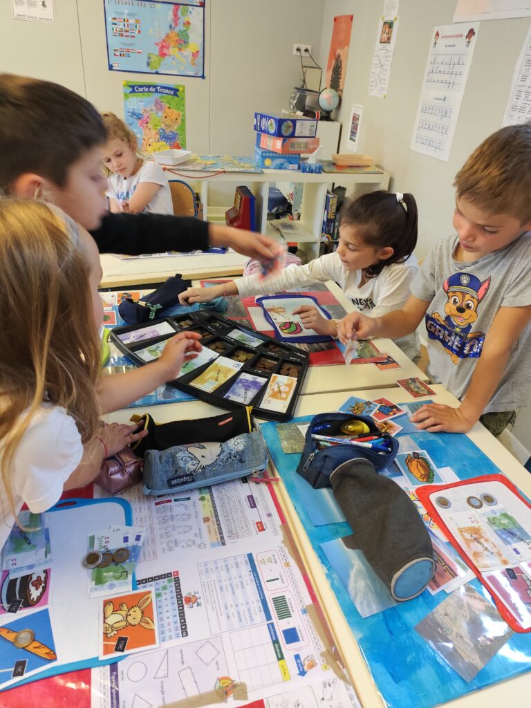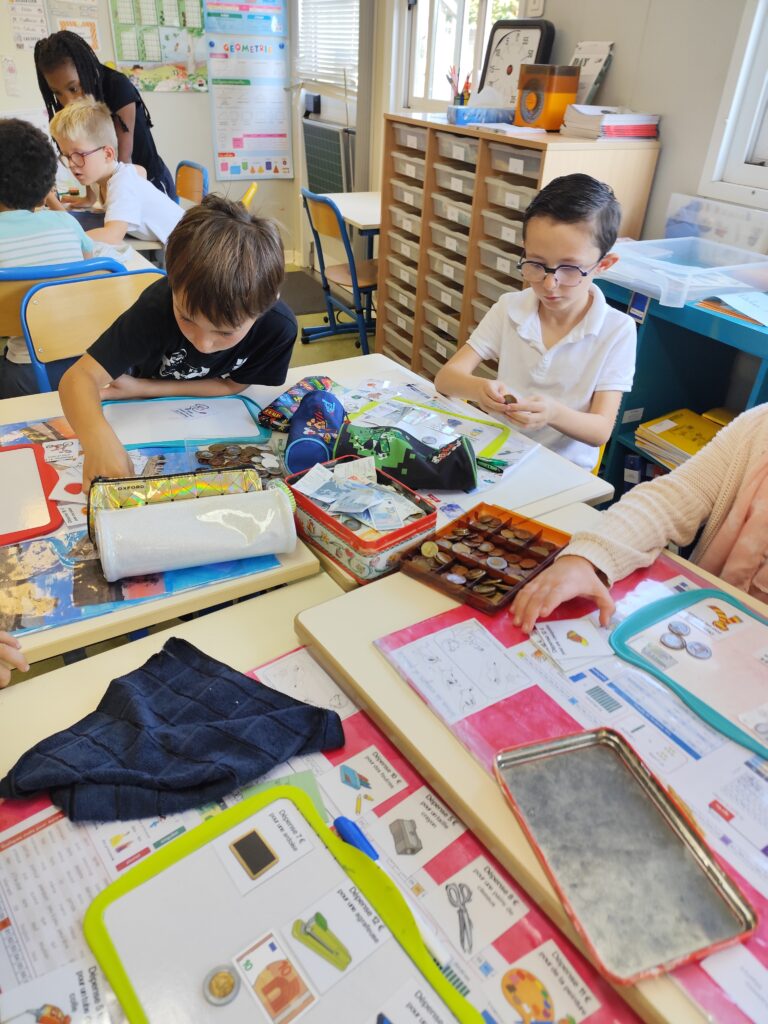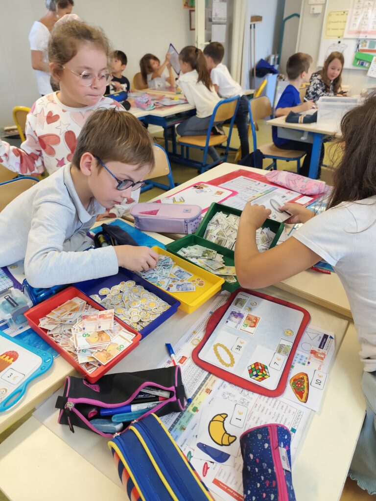 Les CP et les CE1 se sont regroupés pour des Ateliers autour de la monnaie : reconnaitre les pièces et les billets, constituer des sommes…