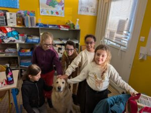 Orphée est revenue nous voir ce matin lors de l’APC. Au programme: des discussions sur les animaux de compagnie, des caresses pour la golden retriever, et sa participation active au jeu “vocabulon” pour travailler le vocabulaire en s’amusant, réfugiée sous la table.
