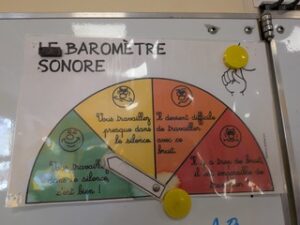 Nous avons un baromètre sonore pour se rendre compte et réguler le bruit dans la classe.