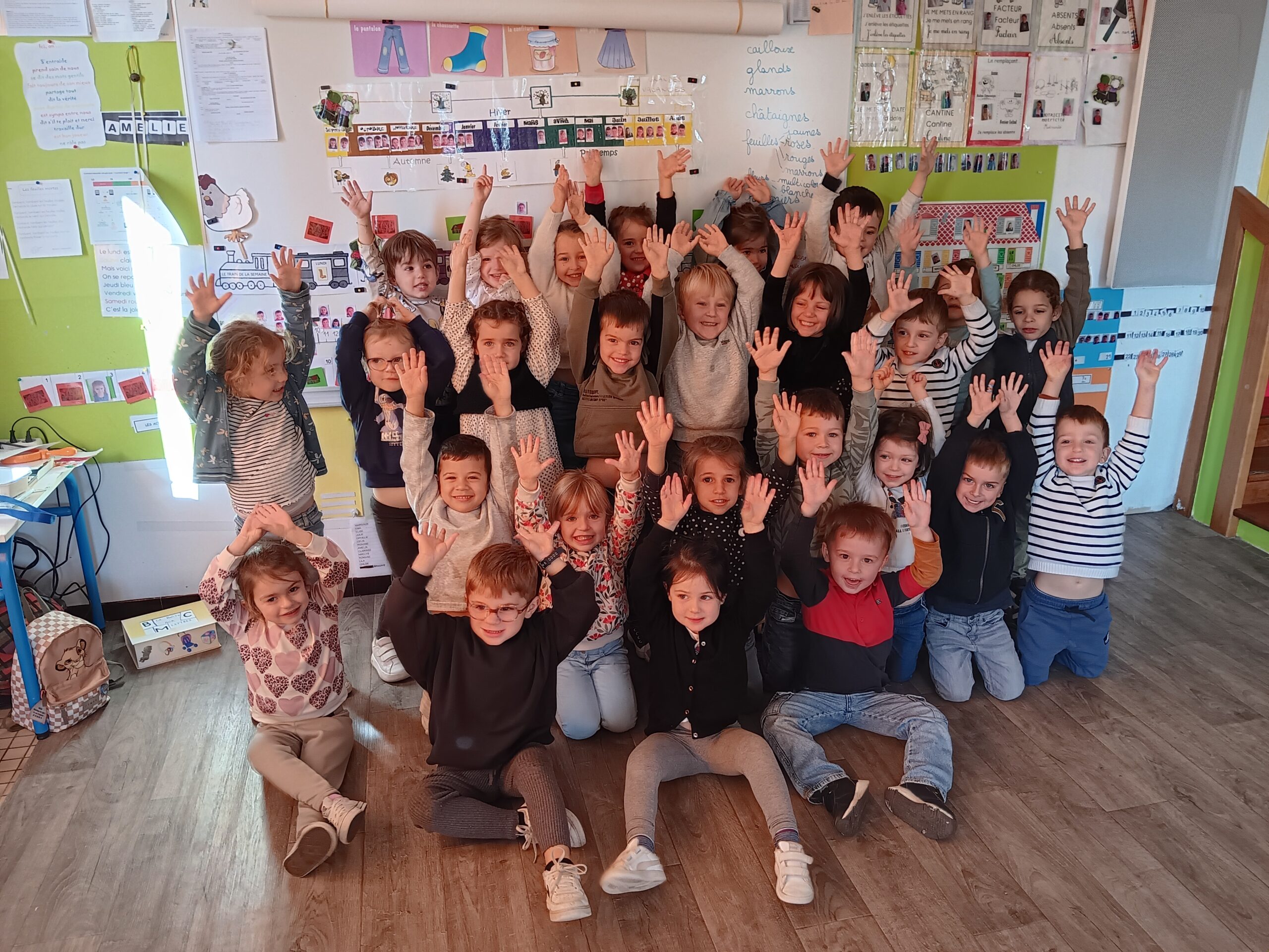 Dans notre classe, nous sommes 24: 18 MS et 6 GS. Nous voici: Cette année, notre classe de parrainage est la classe de CE1. Nous